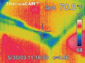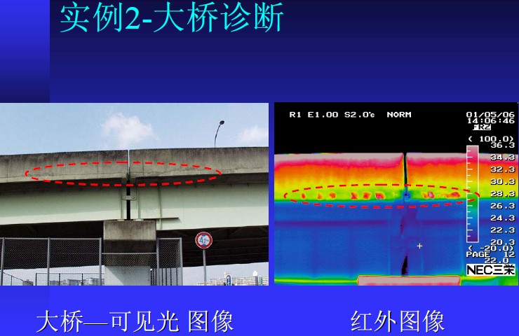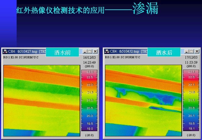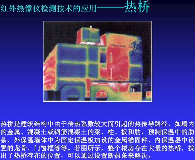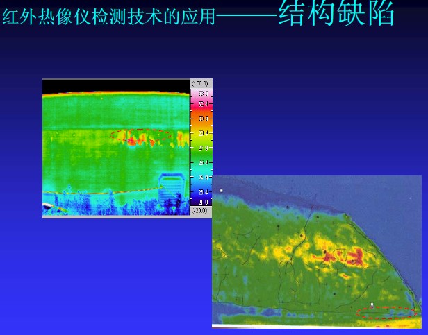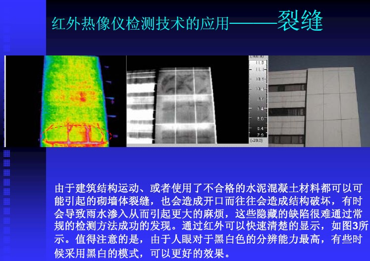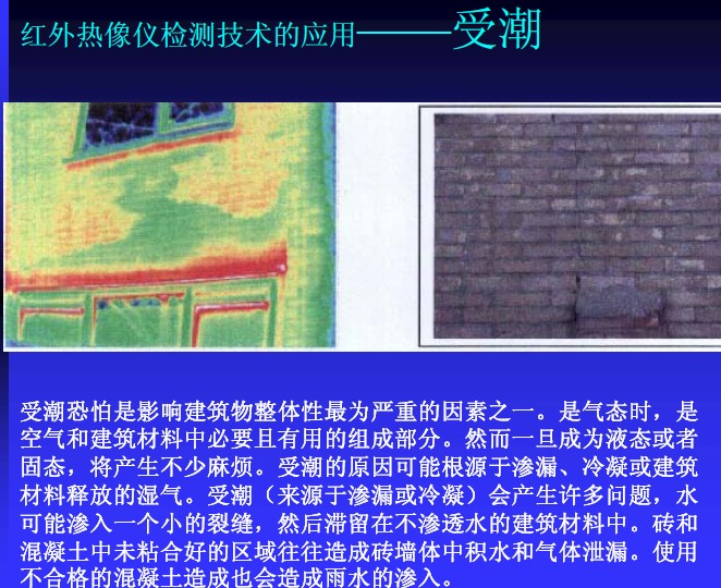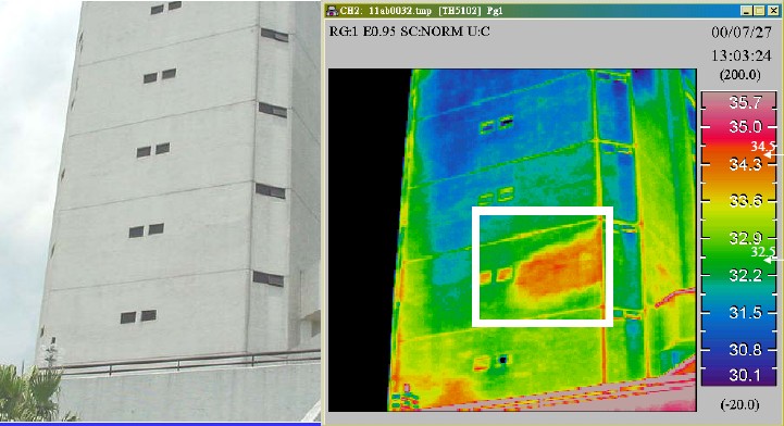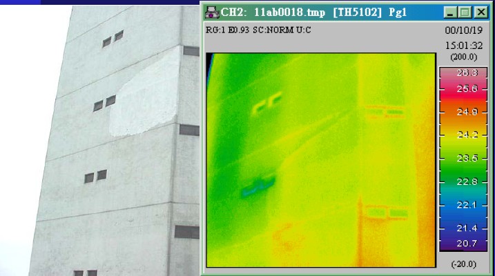 粘飾面由于粘貼不良,容易造成滲水甚至剝落。粘貼飾面掉下來砸中汽車或者行人的時間偶爾發生,往往造成嚴重的經濟和社會危害。如何解決粘貼飾面剝落問題已經成為許多檢測單位和管理機構的難題。因為這種問題在事故發生之前,往往沒有什么征兆。然后這些缺陷往往逃不過紅外熱像儀的“眼睛”。根據05年8月2號解放日報報道,通過紅外熱像儀手段對建筑結構損傷“望、聞、切”的研究已經在上海得以實踐并取得很好的效果。根據香港工程質量檢測中心的文獻披露,香港隊許多重要建筑物的粘貼飾面都已經成功的使用紅外熱像儀進行定期檢查。