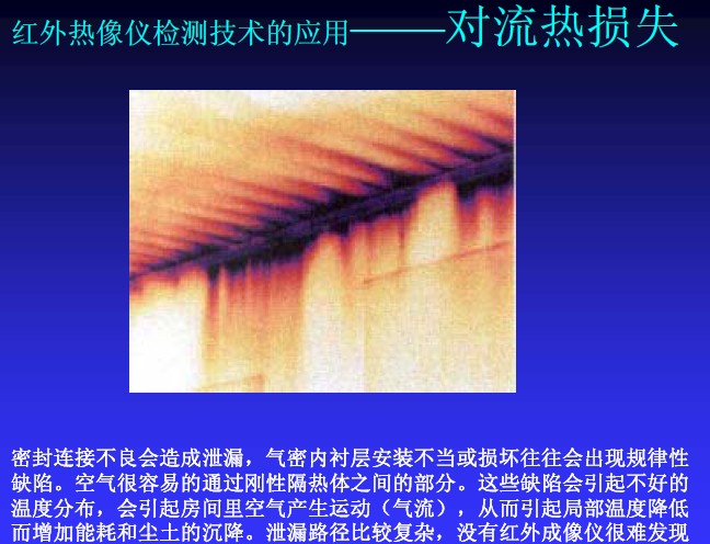 密封連接不良會造成泄漏,氣密內襯層安裝不當或損壞往往會出現規律性缺陷。空氣很容易的通過剛性隔熱體之間的部分。這些缺陷會引起不好的溫度分布,會引起坊間里空氣產生運動(氣流),從而引起局部溫度降低而增加能耗和塵土的沉降。泄漏路徑比較復雜,沒有紅外熱像儀很難發現