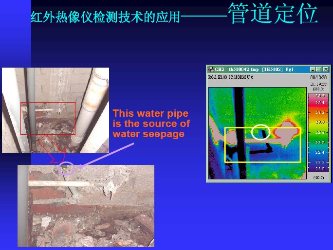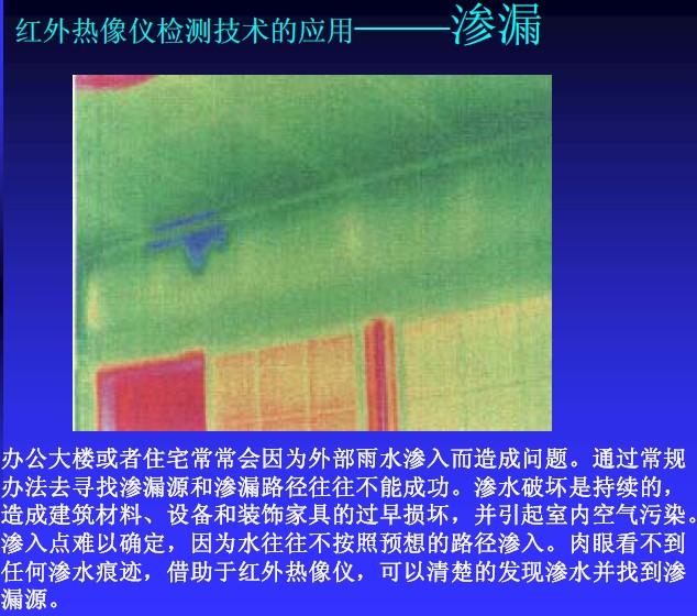 辦公樓或者住宅常常會因為外部雨水滲入而造成問題。通過常規辦法去尋找滲漏源和滲漏路徑往往不能成功。滲水破壞是持續的,造成建筑材料,設備和裝飾家居的過早損壞,并引起室內空氣污染。滲入點難以確定,因為水往往不按照預想的路徑滲入。肉眼看不到任何滲水痕跡,借助于紅外熱像儀,可以清楚的發現滲水并找到滲漏源。?