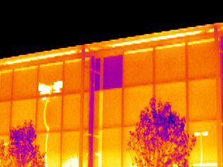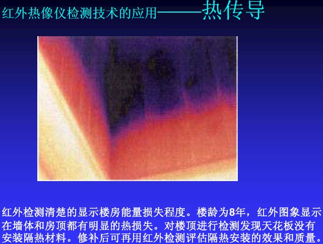 紅外檢測清楚的顯示樓房能量損失程度。樓齡為8年,紅外圖像顯示在墻體和房頂都有明顯的熱損失。對樓頂進行檢測發現天花板沒有安裝隔熱材料。修補后可再用紅外檢測評估隔熱安裝的效果和質量。