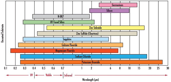紅外 (IR) 照射的特征是波長介于 0.750 -1000μm (750 – 1000000nm) 之間。由于對檢測器范圍的限制,IR照射通常分為以下三個較小的區域:0.750 – 3μm、3 – 30μm 和 30 – 1000μm 分別定義為近紅外 (NIR)、中波紅外 (MWIR) 與遠紅外 (FIR)(圖 1). 紅外產品 廣泛用于從熱成像中的 IR 信號檢測到 IR 光譜學中的元素識別等多種應用。隨著 IR 應用需求的發展和技術進步,制造商已開始使用 IR 材料設計平面光學元件(例如 (i.e. 窗口片, 反射鏡, 偏振片, 分光鏡, 棱鏡), 球面透鏡 (例如平凹/平凸透鏡、雙凹/雙凸透鏡、彎月透鏡), 非球面透鏡 (拋物面、雙曲面、混合透鏡), 消色差透鏡, 以及 裝配組件 (例如成像鏡頭、擴束器、目鏡、物鏡). 這些 IR 材料或基底的物理特性各不相同。因此,了解每種材料的優點可為任何 IR 應用選擇正確的材料.